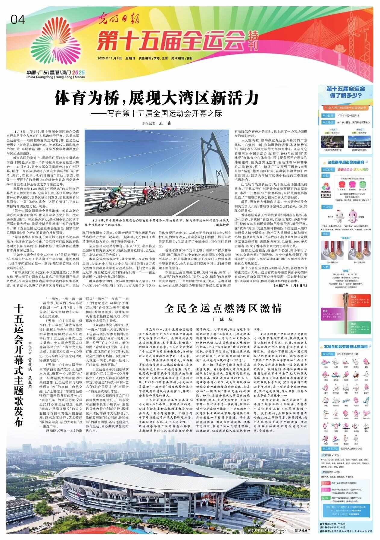 位于广州的广东奥林匹克体育中心。新华社消息,万众瞩目的第十五届全运会开幕式将于11月9日晚在广东奥林匹克体育中心举行。全运会是我国规模最大、水平最高、影响最广的综合性体育赛事。第十五届全运会是中国共产党第二十次全国代表大会后举办的首届全国运动会。成功举办全运会是我国政治生活中的一件大事。与往届全运会不同的是,本次赛事首次由粤港澳三地联合主办。这是全运会历史上首次在香港、澳门举办。这是党和国家赋予粤港澳的特殊使命。这是推动粤港协同发展、互利合作的重要一步ng 和澳门大湾区。也是向世界展示“一国两制”体制优势和体育领域创新实践的一扇明亮窗口。其意义重大、影响深远。第十五届全运会体育比赛共设大项34个、小项419个。值得注意的是,公路自行车赛和马拉松赛都是全运会历史上首次跨界比赛项目。该公路自行车路线经港珠澳大桥穿越珠海、香港和澳门。这是第十五届全运会唯一连接粤港澳的标志性赛事。马拉松赛事依托深圳湾大桥穿越深圳和香港。比赛过程中,内地、港澳三地的运动员毫无意义地擦肩而过,而观看比赛的观众则可以同时领略大湾区三地的独特文化。时间。这是区域一体化发展时代的新篇章,也是“体育湾区”建设的重要机遇。推动粤港澳大湾区从基础设施“硬联通”转向政策机制“软联通”,最终实现民心“心联通”。这一切都得益于粤港澳大湾区高质量发展。自《粤港澳大湾区发展规划纲要》发布以来,在我国开放水平最高、经济活力最强的热土伊藤建设粤港澳大湾区,成为新时代推动形成全面开放新格局的新尝试、推动“一国两制”发展的新实践。如今,港澳居民出行更加便利到大湾区内地城市学习、工作和生活。大湾区市场一体化程度大幅提升,国际科技创新中心建设持续推进……粤港澳不断朝着建设国际一流湾区和一流城市群的目标迈进。举办十五运会成为以体育为纽带,促进三地人民增强了解和接近的新契机,让湾区建设更加丰富。全运会对于提高我国运动员竞技能力、弘扬体育精神、增强民族自信心具有重要作用。同时,全运会也是继续推动全民健身事业发展的良好契机。体育强国建设是中国现代化建设的重要组成部分。北京的冬天奥运会“带动了3亿人参与冰雪运动”,十五运会也将掀起新一波全民健身热潮。我们看到,香港队派出了52人的强大阵容参加群众羽毛球比赛,足见羽毛球运动在香港的普及程度和受欢迎程度;空手道在澳门已有60多年的历史,是一项非常受欢迎的运动。它不仅走进校园、走进社区,还为世界各地培养了众多运动员。运动员……“激情全运,活力大湾区”,粤港澳三地主办的第十五届全运会一定会在中国体育史上留下浓墨重彩的一笔。我们期待全国运动员在岭南大地上挥洒汗水、奋力拼搏。我们也很高兴看到体育成为一个广阔的舞台,可以在世界上清晰地讲述新时代湾区和中国的故事。 (作者:陈成)