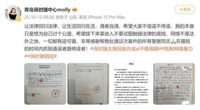 10月12日,青岛市保时捷女销售员关某女士在社交媒体上发布了青岛市公安局分局的行政处罚决定。行政处罚决定书显示,有人将牟某文的图片和文字传至群内,并搭配不良视频侮辱其后被抓获。根据《中华人民共和国治安管理处罚法》第四十二条第二款的规定,决定给予行政禁制五日的行政处罚。此前报道:近日,青岛保时捷销售中心工作人员牟女士在社交媒体上称,自己最近发现了人工智能无意合成的虚假不良视频,对他进行诽谤和侮辱。他向公安机关报案,并“决心追究所有涉案人员的民事和刑事责任”。据报道,牟女士现年 34 岁,2023 年和 2024 年连续两年销售 170 辆保时捷,是年度保时捷销量的两倍。今年9月,他再次成为保时捷月度销量冠军,并领跑热搜榜。 ▲ 女士牟